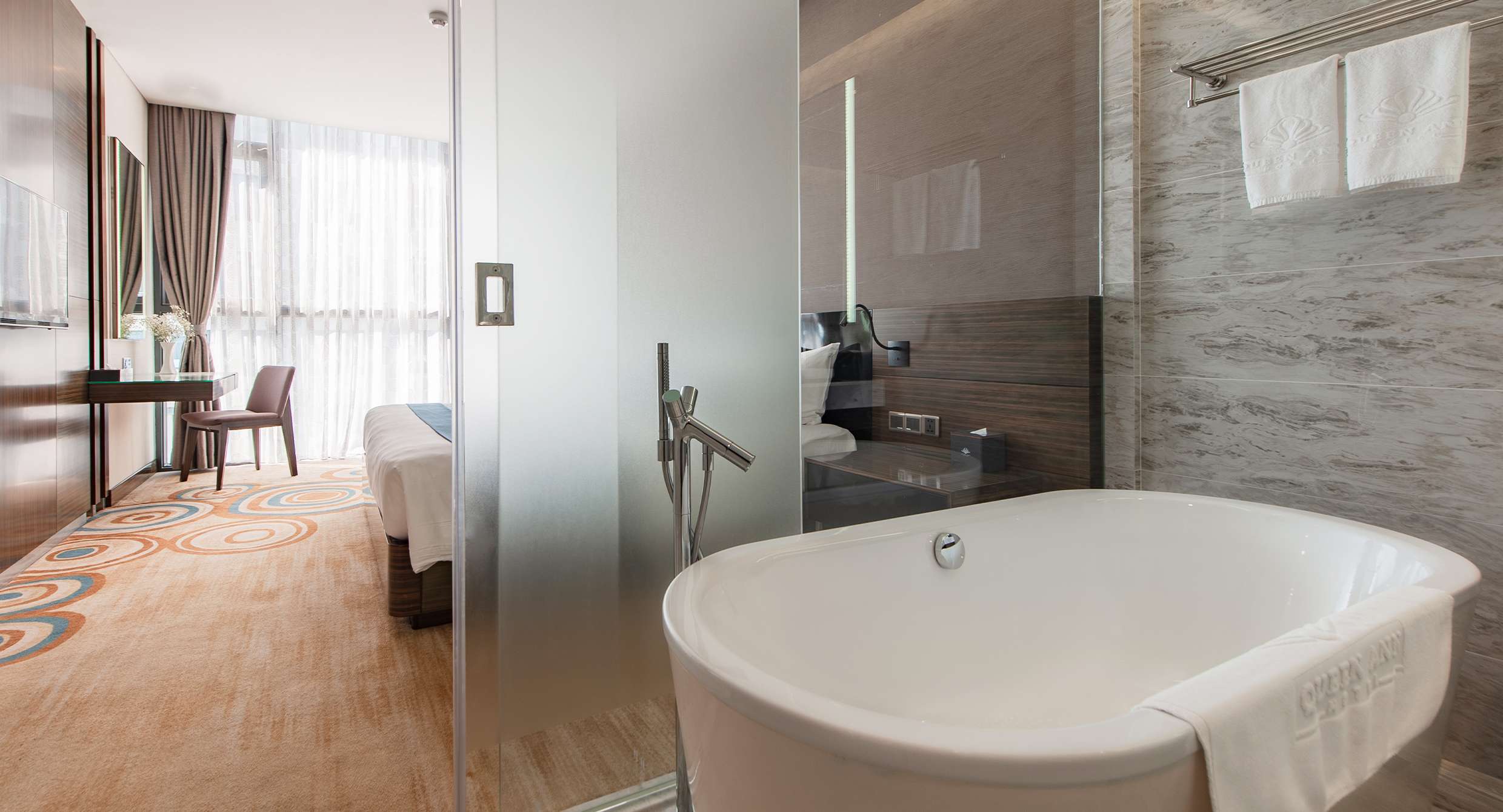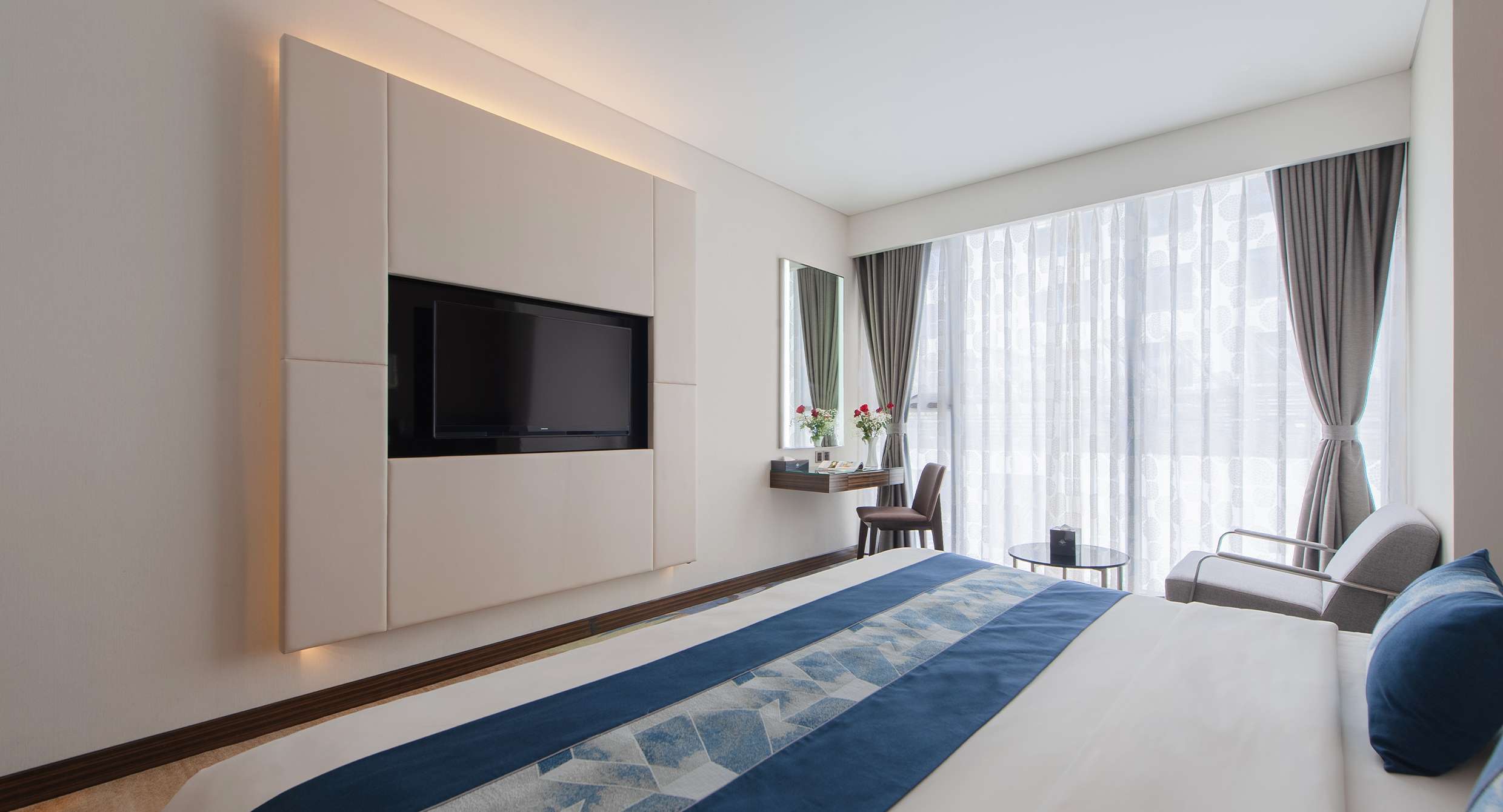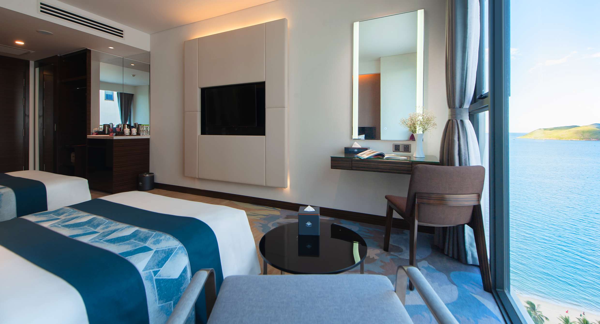 Grand Deluxe Twin Sea View 방은 원형 Nha Trang 해만을 포괄하는 특별 전망이 있는 방입니다. 면적이 32m2인 Grand Deluxe Twin Sea View 방은 1m2 x 2m 크기의 싱글 침대 2개를 마련하여 두 친구에 적합합니다
